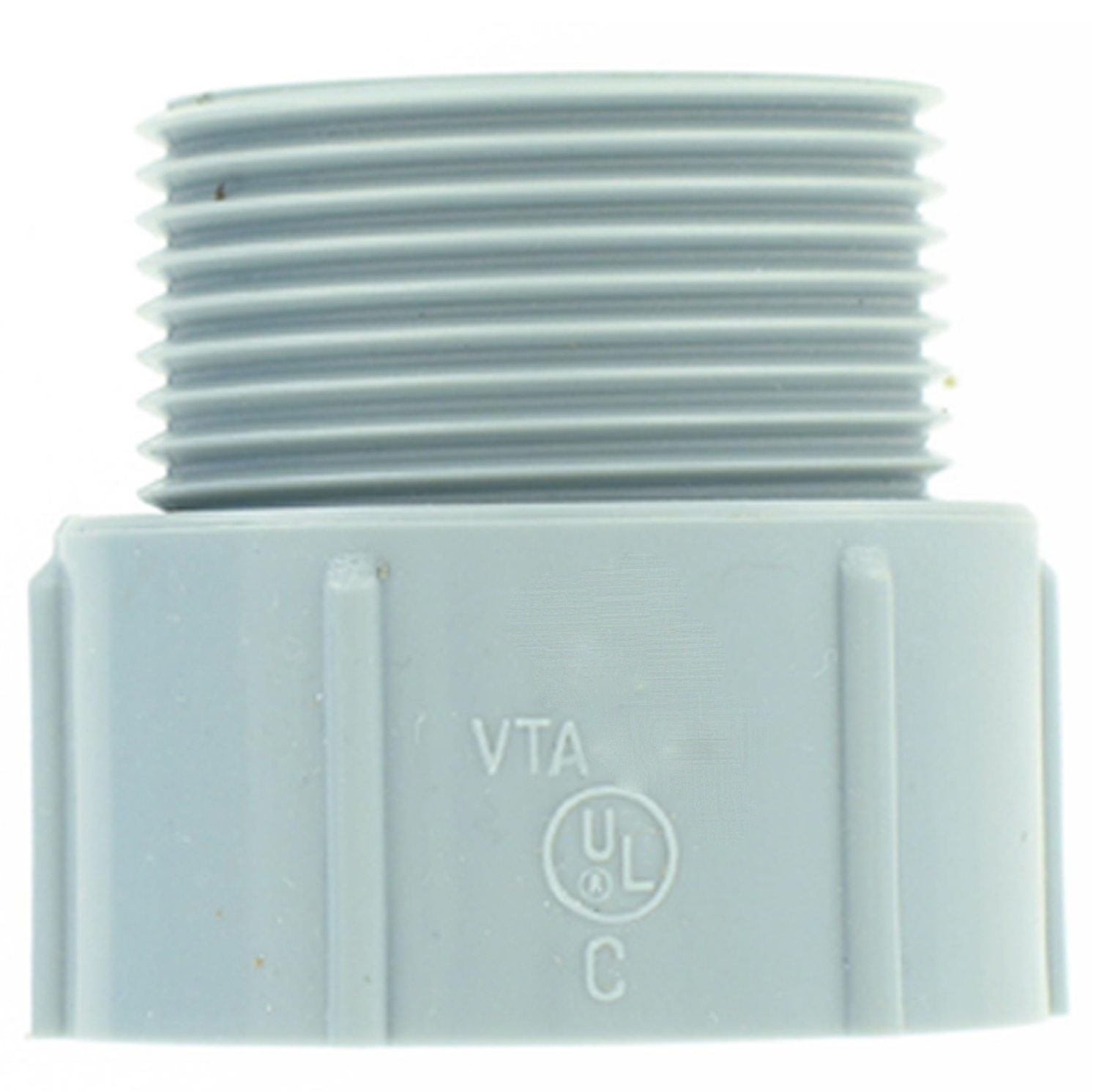 PVC terminal adapter, 1-1/2 Inch socket x male NPT thread; connects PVC conduit to threaded hubs or metallic boxes.