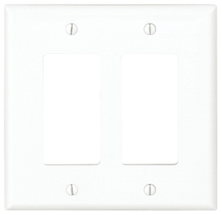 Eaton PJ262W 2-gang white decorator wallplate, nylon, for two Decora-style switches or receptacles, mid/standard size, screw mount, designed for clean alignment on double-gang boxes.