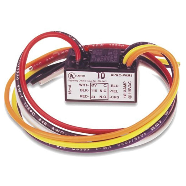 Compact encapsulated relay with 1 Form C 10A contact and 24V AC/DC coil, ideal for fan shutdown, door holders and other fire alarm control interfacing.