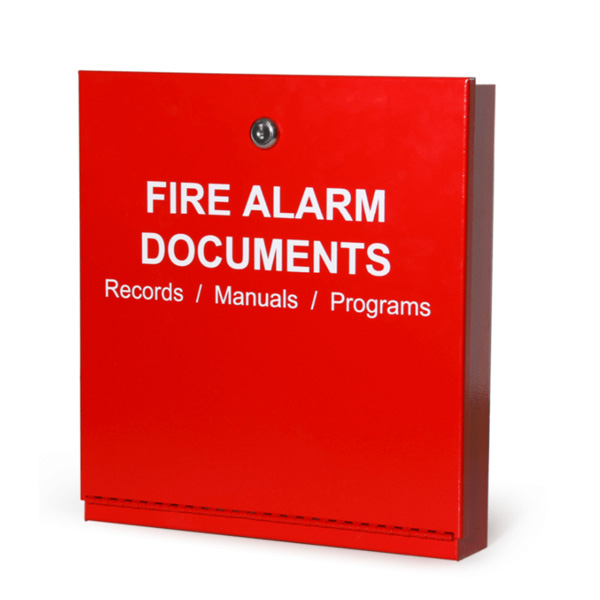 Red 12" x 13" steel fire alarm document box with Cat 30 keyed lock, key hooks and card holder to keep drawings and records protected and NFPA-72 compliant.