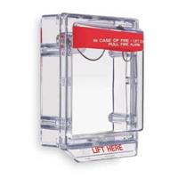 Stopper II red polycarbonate pull station cover with built-in 95/105 dB horn and clear spacer deterring false alarms while allowing normal activation.