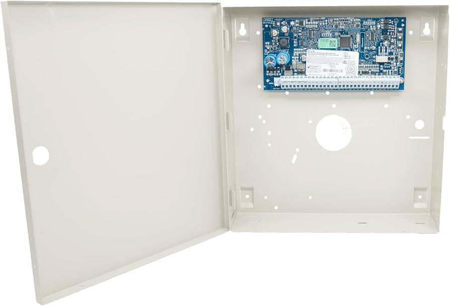 Bare 64-zone Neo main board in cabinet (no keypad), ideal for custom-build hybrid security systems with PowerG wireless support.