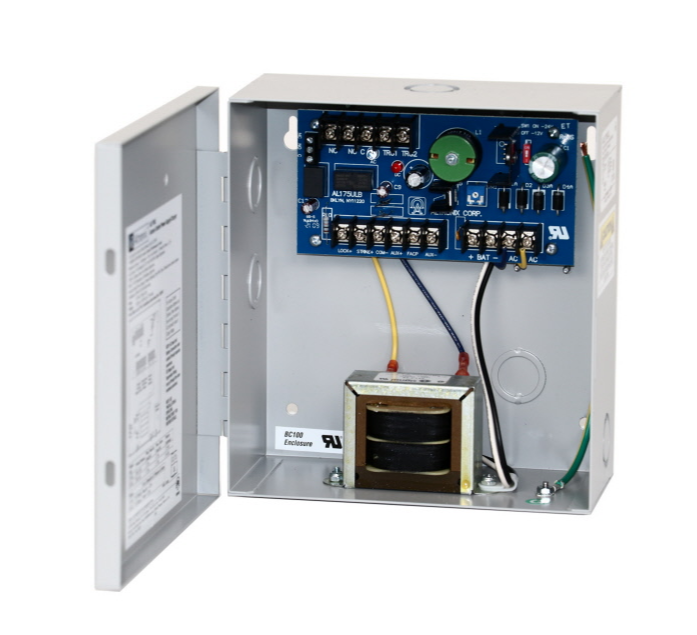 12VDC 1.75A wall-mount power supply/charger with battery backup for mag-locks strikes and panels requiring reliable Class 2 power in a steel enclosure.