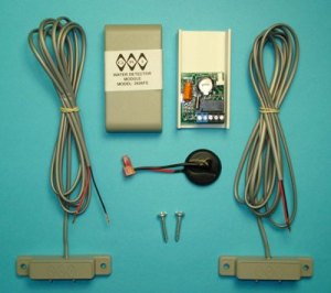 Flood/leak detector with remote probe designed to sense conductive liquids and trigger an alarm or shut-down circuit when water reaches the sensor.