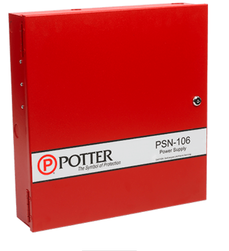 PSN-106 10-amp 6-NAC power supply/expander providing additional supervised notification circuits for Potter fire alarm systems.