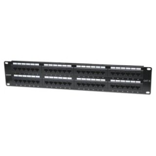 1U/2U rackmount 48-port Cat6 patch panel with numbered ports; organizes horizontal cabling and supports Gigabit throughput in network racks.