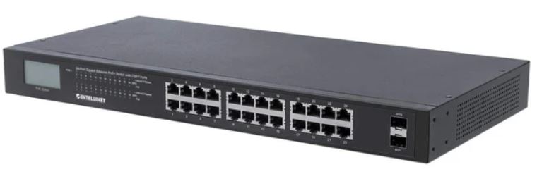 24-Port Gigabit Ethernet PoE+ Switch with 2 SFP Ports and LCD Screen